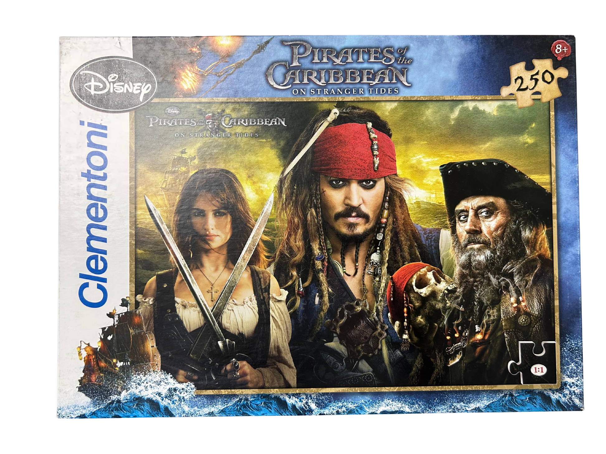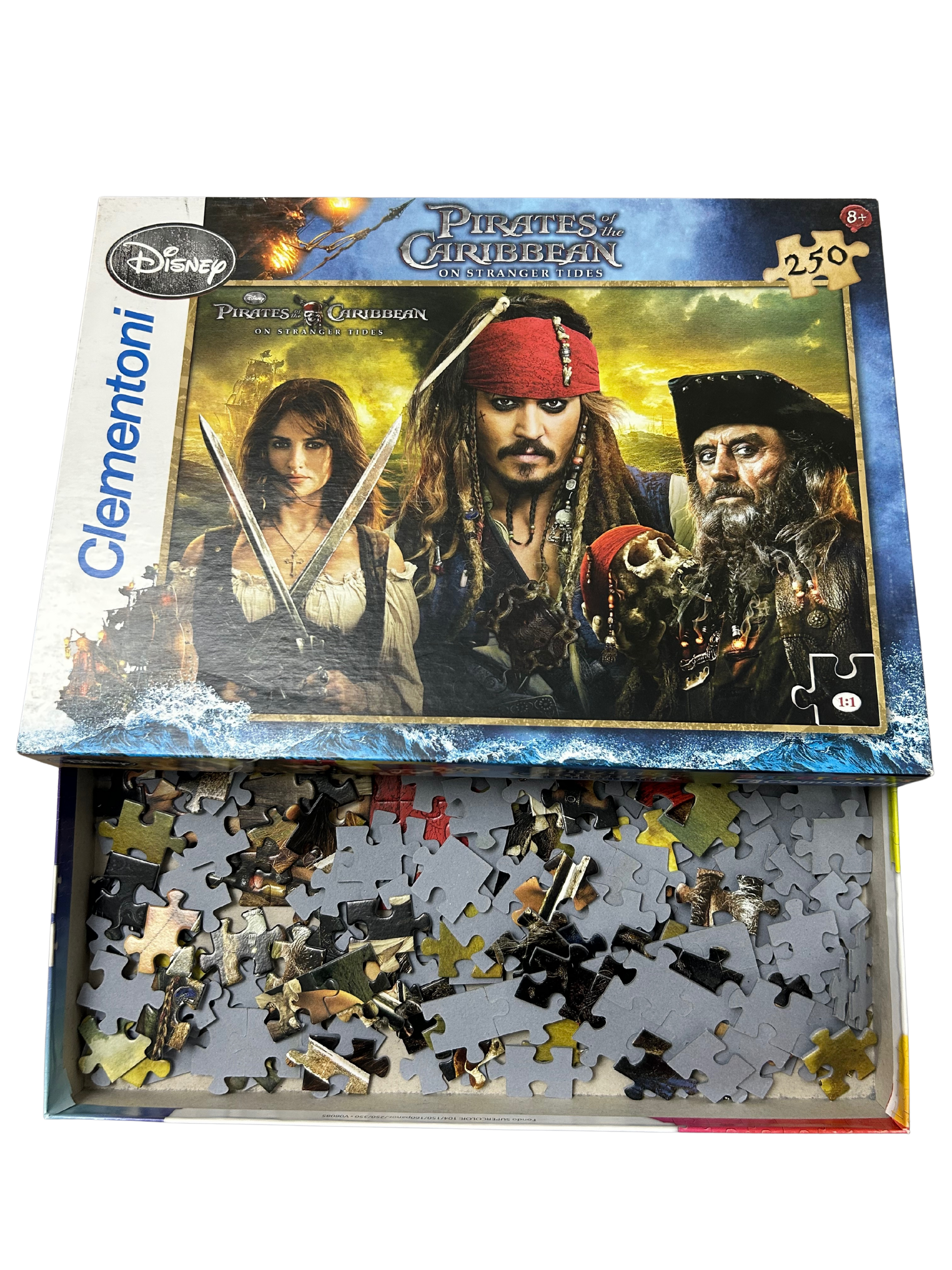 A dynamic 250-piece jigsaw puzzle featuring scenes from Pirates of the Caribbean: On Stranger Tides, capturing swashbuckling adventure and pirate action in vivid detail.