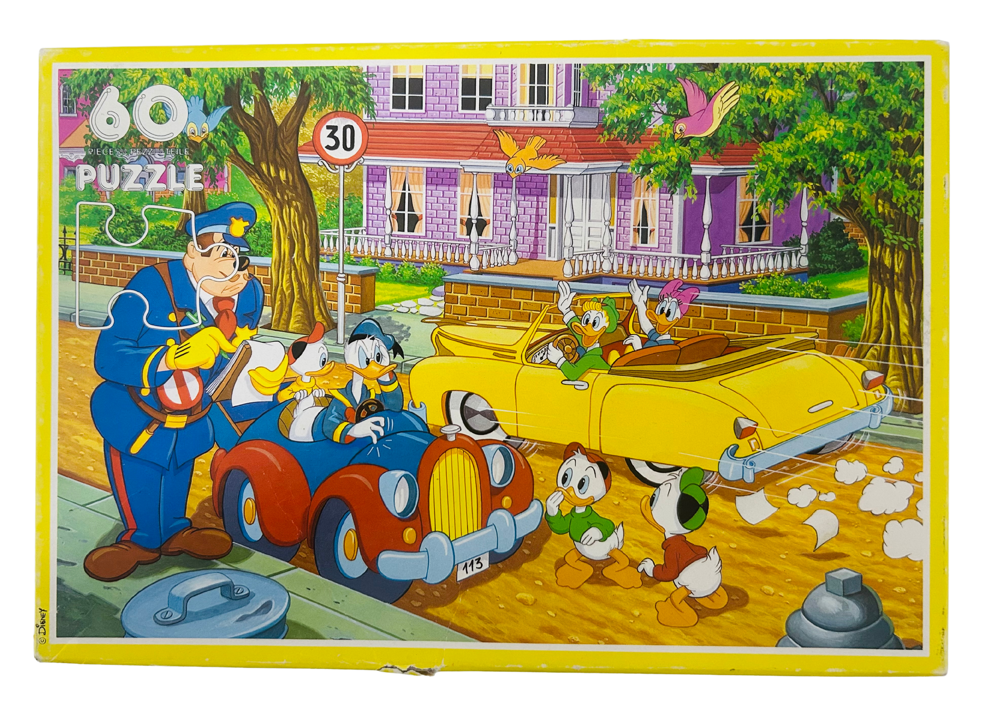 A fun and colorful puzzle showing Donald Duck getting a ticket from a police officer while Daisy and the nephews look on. In the background, a yellow car zooms by with Gladstone Gander and Webby. Classic Disney chaos in a cheerful street scene!
