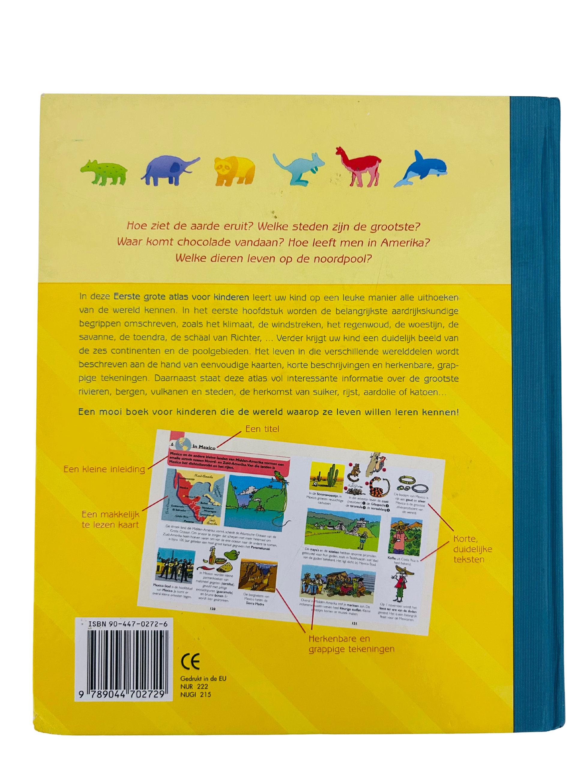 What does the earth look like? Which cities are the largest? Where does chocolate come from? How do people live in America? Which animals live at the North Pole? In this First Great Atlas for Children, your child will learn about all corners of the world in a fun way. The first chapter describes the most important geographical concepts, such as climate, cardinal points, rainforest, desert, savannah, tundra, the Richter scale, ... Your child will also get a clear picture of the six continents and the polar regions. Life in these different parts of the world is described using simple maps, short descriptions and recognizable, funny drawings. In addition, this atlas is full of interesting information about the largest rivers, mountains, volcanoes and cities, the origin of sugar, rice, oil or cotton ... A beautiful book for children who want to learn about the world they live in!