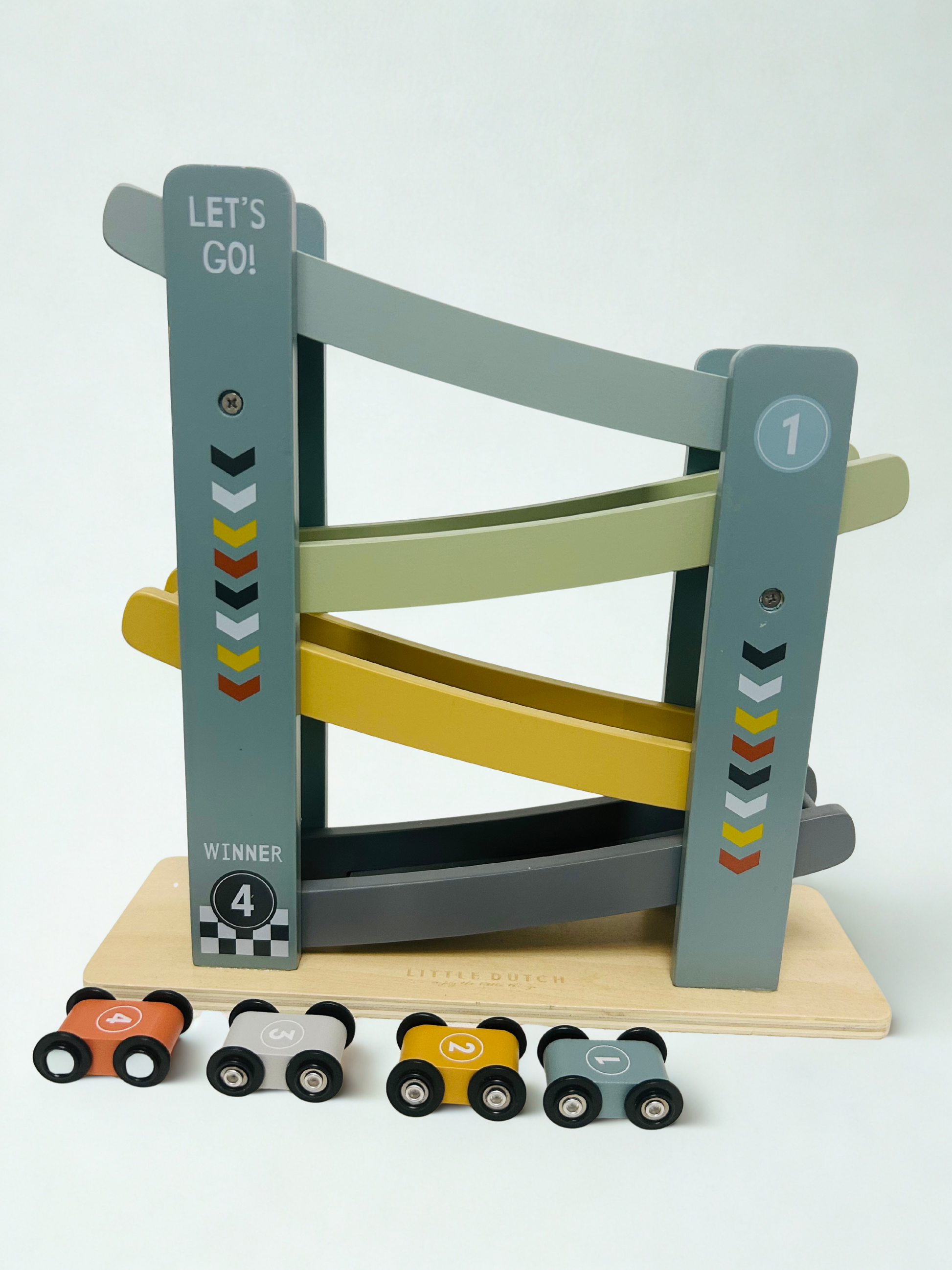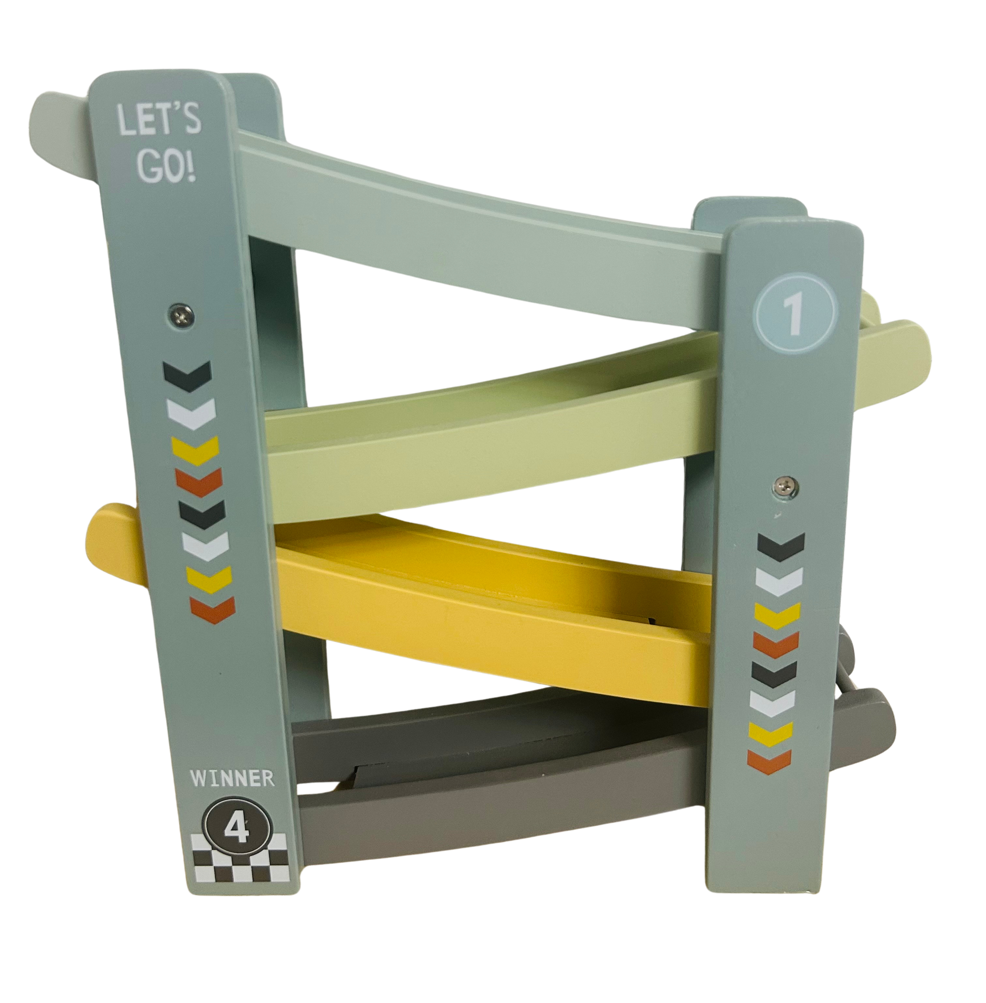 1, 2, 3, let's race! Your little one will have a great time with this cheerful wooden race track including 4 cars. Place the cars one by one on top of the race track, let them go and they will race down. Children will love this!