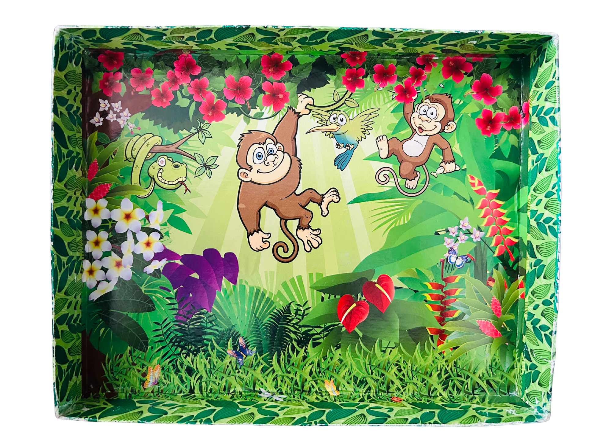 A colorful 50-piece jungle puzzle for children aged 3+, featuring playful animals like monkeys, elephants, and tigers. Includes 6 standing animal figures for added fun and interaction. Size: 20 x 26 cm.